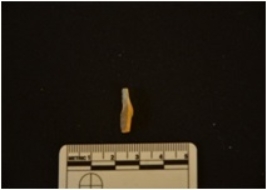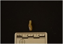 | Description / विवरण | Chalcedony point fragment has a midridge on dorsal side, striking platform, diffused bulb on ventral side, broken from pointed distal end, heated, retouches and use-wear marks on edges. |
