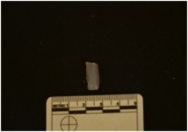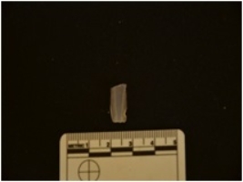 | Description / विवरण | Chalcedony blade fragment has two ridges on dorsal side, striking platform, bulb on ventral side, broken from distal end and retouches on edges. |