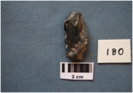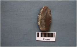 | Description / विवरण | Scraper, made on a blade-like chert flake, retouch along the right lateral edge on ventral side, bulb absent, prepared platform, encrustation on both sides, cortex on dorsal side. |
