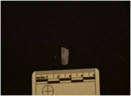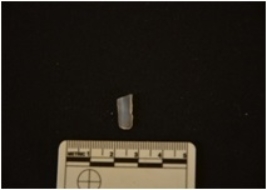 | Description / विवरण | Chalcedony blade fragment has two ridges on dorsal side, broken from proximal end, use-wear marks on edges and trapezoidal cross-section. |