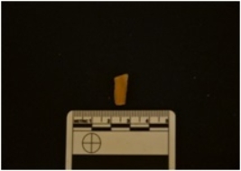 | Description / विवरण | Chalcedony blade fragment has two ridges on dorsal side, striking platform, diffused bulb on ventral side, broken from distal end, retouches on edges and heated. |