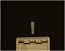 | Description / विवरण | Chalcedony blade fragment has ridge on dorsal side, broken from both ends, retouches and use-wear marks on edges. |