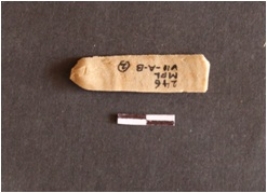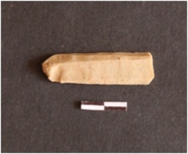 | Description / विवरण | Chert blade fragment has three ridges on dorsal side, striking platform, bulb on ventral side broken from distal end, roughly trapezoidal cross-section and use-wear marks on edges. |