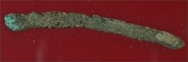| Description / विवरण | Trench ZA 3, Qdt 4, layer 3, depth 40 to 55 cms It s a broken nail of copper. Shape is slender, surface is rough and little curved with deposition of hard patina. One end is broken. |