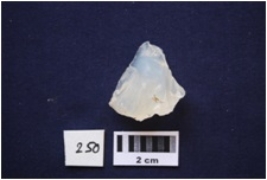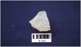 | Description / विवरण | Chalcedony 1. Flake with prepared platform, diffused bulb on ventral side, use-wear marks along the cutting edge. |