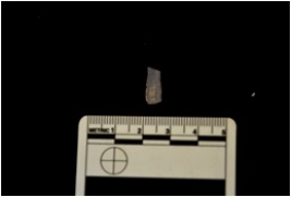| Description / विवरण | Blade made on chalcedony, use wear marks along both eges, re-use marks along one edge, bulb of percussion visible, broken at the distal end |