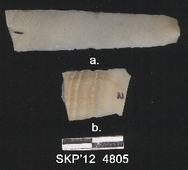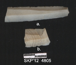 | Description / विवरण | Chert blade with triangular cross section at one end and tapered other end has a bulb of percussion at the ventral side grayish. Retouched, denticulated marks. |
