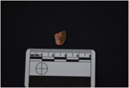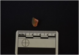 | Description / विवरण | Fragment of a blade made on chert, use wear marks visible on both edges, bulb of percussion visible, broken at the distal end |