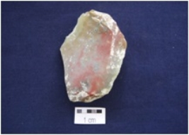 | Description / विवरण | A utilised chert flake, one surface smooth and the other rough and encrusted i.e. natural. Bulb is prominent with a little use-marks on the edges. |