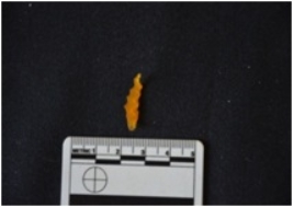 | Description / विवरण | Chalcedony utilized flake has flake scars on dorsal side striking platform, bulb on ventral side and use-wear marks on working edges. |