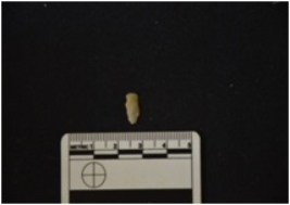 | Description / विवरण | Chalcedony blade fragment has crested guided ridge on dorsal side, broken from proximal end, triangular cross-section and use-wear marks on cutting edges. |