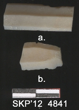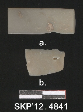 | Description / विवरण | Small chert blade fragment with flaked ridges, bent at the and trapezium cross section at one end. |