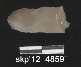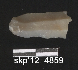 | Description / विवरण | This is chert blade, with one end broken, trapezium cross section, flaked ridges, denticulate marks on the margins, bulb of percussion on the end. |