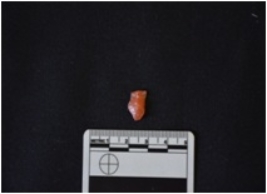 | Description / विवरण | Carnelian blade fragment has a crested guided ridge on dorsal side, striking platform, diffused bulb on ventral side, broken from distal end, triangular cross-section and use-wear marks on cutting edges. |
