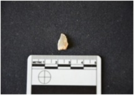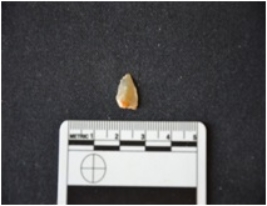 | Description / विवरण | Chalcedony utilized flake has a ridge on dorsal side, striking platform, bulb on ventral side and use-wear marks on working edge. |
