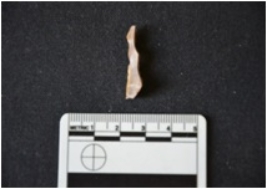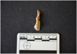 | Description / विवरण | Chert blade has a wavy ridge on dorsal side, striking platform, chipped off bulb on ventral side, uneven cutting edges and triangular cross-section. |
