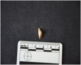 | Description / विवरण | Fragment of chert blade has two ridges on dorsal side, striking platform, bulb on ventral side, broken from distal end and use-wear marks on cutting edge. |