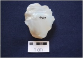 | Description / विवरण | Side scraper, made on an end-struck chalcedony flake, diffused bulb on the ventral side, partly retouched on dorsal side along the left lateral edge, prepared platform. |