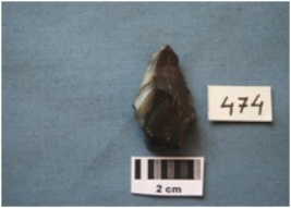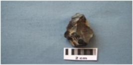 | Description / विवरण | Side scraper, made on an end struck chert flake-like blade, prepared platform, bulb absent on the ventral side, regular retouch along the right lateral edge on dorsal side. |