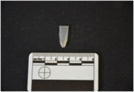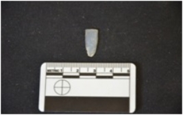 | Description / विवरण | Fragment of chalcedony blade has two ridges on dorsal side, striking platform, bulb on ventral side, broken from distal end and use-wear marks on cutting edge. |