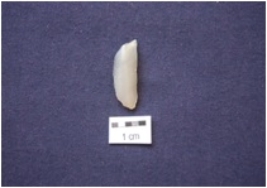 | Description / विवरण | Lunate, made on Chalcedony blade, backed along both ends on dorsal side, use-wear marks along the cutting edge, bulb absent on ventral side. |
