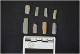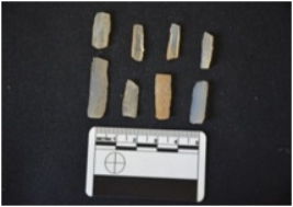 | Description / विवरण | Fragment of chalcedony blade has two ridges on dorsal side, broken from both ends, use-wear marks on cutting edge and trapezoidal cross-section. |