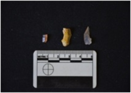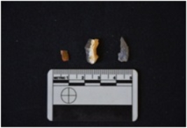 | Description / विवरण | Fragment of chalcedony blade has a midridge on dorsal side, striking platform, bulb on ventral side, broken from distal end, use-wear marks on cutting edge and triangular cross-section. |