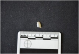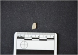 | Description / विवरण | Fragment of chalcedony blade has a ridge on dorsal side, broken from both ends, use-wear marks on cutting edges and triangular cross-section. |