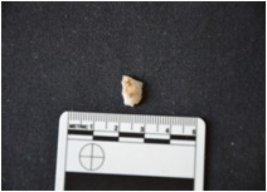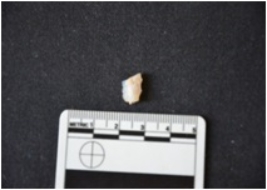 | Description / विवरण | Fragment of chalcedony blade has two ridges on dorsal side, striking platform, bulb on ventral side, use-wear marks on cutting edges and trapezoidal cross-section. |