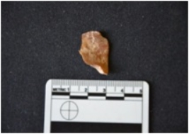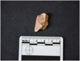 | Description / विवरण | Chert utilized flake has flake scars on dorsal side, striking platform, broken from distal end and use-wear marks on working edge. |