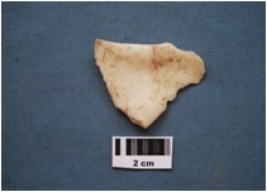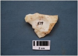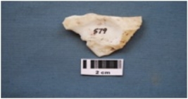| Description / विवरण | Side Scraper, made on side struck chert flake, flakescar on dorsal side, diffused bulb on the ventral side, irregular retouch along the left lateral edge on ventral side. |