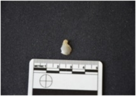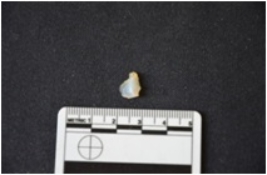 | Description / विवरण | A Chalcedony utilized flake has a ridge and flake scars on dorsal side, striking platform, bulb on ventral side and use-wear marks on working edge. |