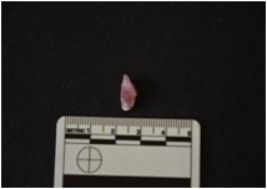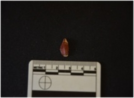 | Description / विवरण | Chert blade fragment has a ridge on dorsal side, striking platform, bulb on ventral side, broken from distal end and use-wear marks on cutting edge. |