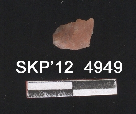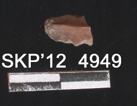 | Description / विवरण | This is a chert blade fragment with one end broken with triangular cross section, other end rounded and retouched. There is a bulb of percussion on this end ventral side. Red is color and one ventral margins shows denticulated marks. |