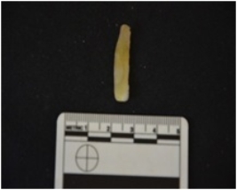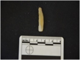 | Description / विवरण | Blade made on chalcedony, use wear marks along one edge |