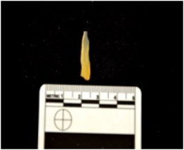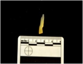 | Description / विवरण | Blade made on chalcedony, use wear marks seen along both edges |