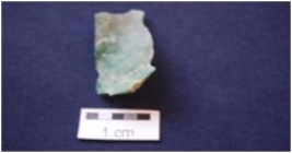 | Description / विवरण | Fragment of a blade, made on Moss Agate, broken along one end, narrow platform along proximal end, negative bulb on ventral side. |