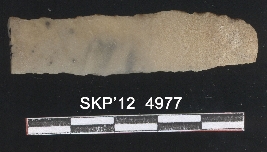 | Description / विवरण | This is a chert blade with broken ends. One end cross section is of trapezium shape. Tapered towards the other end. Two flaked ridges on the dorsal side and denticulated margins. Little black patches on the stone surface and rough patchy texture on the tapered rounded end. |