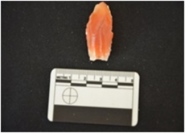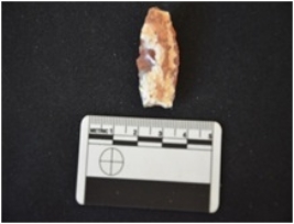 | Description / विवरण | Flake struck of chert, use wear marks on both edges, cortex present on dorsal side |