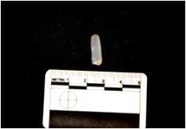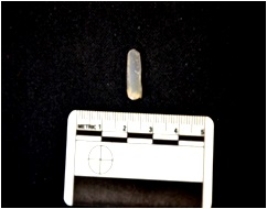 | Description / विवरण | Blade made on chalcedony, use wear marks on both edges, bulb of percussion visible |