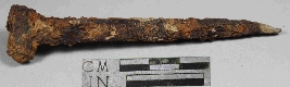 | Description / विवरण | Entirely rusted nail with bulky top and slender bottom. |