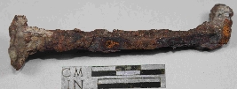 | Description / विवरण | Entirely rusted L shape nail with flat top and slightly bent bottom and rough surface. |