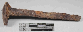 | Description / विवरण | Entirely rusted nail with flat top, straight body and rough surface. |