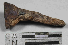 | Description / विवरण | Entirely rusted iron nail with flat top and straight thin body and rough surface. |