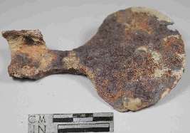 | Description / विवरण | Entirely rusted key with thin neck and circular bottom with rough surface. |