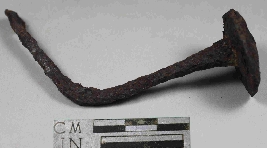 | Description / विवरण | Entirely rusted L shaped nail with flat top and slender body. |