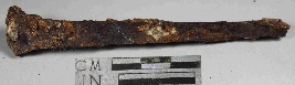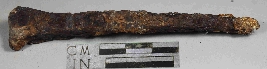| Description / विवरण | Entirely rusted iron nail with broken top and slender body and rough surface. |