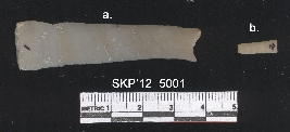 | Description / विवरण | A small other blade with a trapezium cross section at one end, other end is tapered and flattened at the end. Retouched. Flaked ridges on the dorsal side. Sharp margins. |