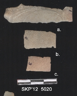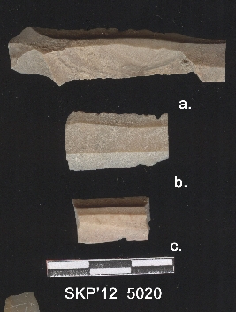 | Description / विवरण | Chert blade fragment, broken ends with trapezium cross section. Ventilated marks on the lateral margins and one cross section. |