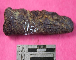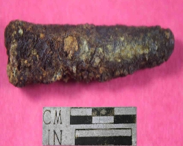 | Description / विवरण | Entirely rusted nail with broken top having conical end and rough surface. |